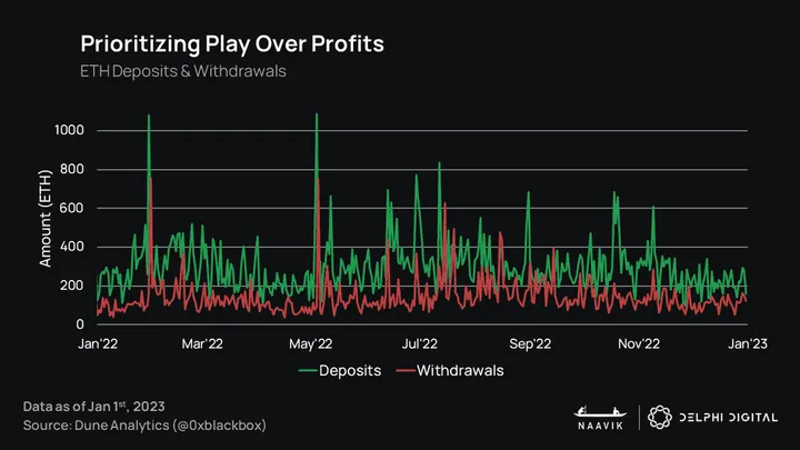 While we believe that most well-funded games teams will be heads-down building for all of 2023, we are eager to see the next generation of blockchain games come online. Titles such as Illuvium, Ember Sword, Guild of Guardians, and Limit Break will be going into public soft launches. We expect these large budget games to soft launch throughout the year, and we are eager to see how they might draw in a new wave of interest based on the quality of the experiences.