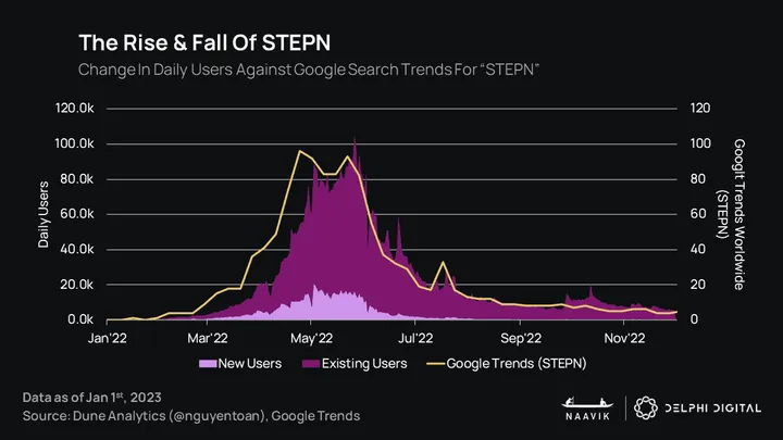 Following in the footsteps of play-to-earn games, a number of companies started applying the “X-to-Earn” model to various use cases. Underlying this trend was the idea that introducing crypto-native incentives to common activities through token rewards could boost engagement and encourage lasting habits. For example, Zenbase offered users rewards for meditating; Proof of Learn came to market with “learn-to-earn” protocol; and STEPN, a “web3 lifestyle app,” made the rounds with a GPS-enabled, “move-to-earn” mobile app. Some of these apps (most notably, STEPN) gained rapid traction as the hope of quick gains drew users in and sent the apps’ token soaring in typical ponzinomic fashion. However, reality caught up with even the hottest names out there, sending these tokens back to their lows — along with other “X-to-earn” games. All in all, the trend proved to be yet another fleeting narrative and a further reminder that a model in which most users expect to profit is fundamentally unsustainable.