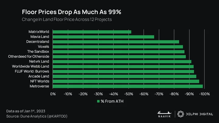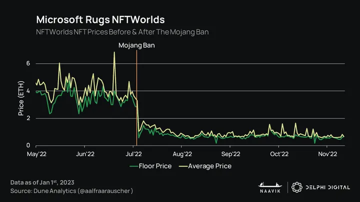 As highlighted in our Key Events section, earlier this year Mojang (and by extension, Microsoft) banned the use of NFTs within Minecraft. The statement adversely affected several existing NFT projects, the most notable of which was NFTWorlds, a blockchain-powered virtual world platform that leveraged Minecraft servers to allow users to earn fungible WRLD tokens and NFTs. Shortly after the announcement, floor prices for its 10k NFT collection dropped 80%, and the price of WRLD fell 72%.