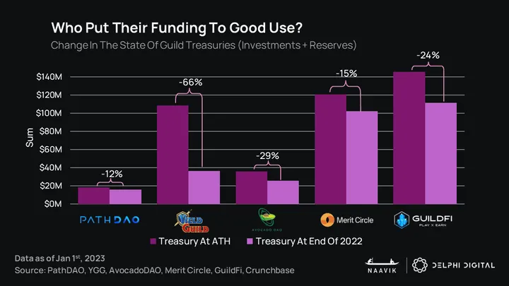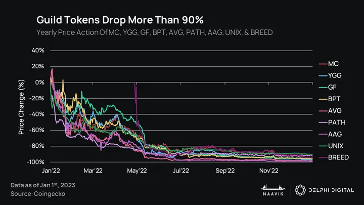- As play-to-earn games proved unsustainable and collapsed, so have the guilds that built their businesses leveraging these games. As a result, most guilds are going out of business, and a few are hunting for ways to pivot – either building tools, leaning into esports, or finding other ways to leverage their large communities. Guilds as they existed before no longer need to exist, but we’re curious about how (and how well) the largest guilds will try to adapt in the new year.