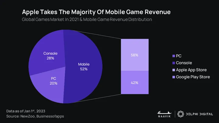 Although this limits the potential utility for in-game NFTs and secures Apple’s 30% cut on all IAPs, developers can now feel confident that if they follow the rules, they will gain access to Apple’s 1B+ users. Furthermore, mobile represents the largest market in terms of gaming revenue and Apple’s App Store generates the majority of mobile game revenues.