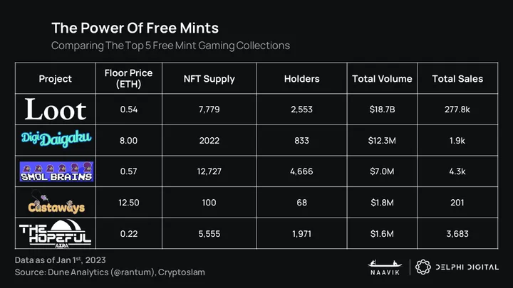 One strategy being used by some projects is to conduct free mints and/or airdrops as a user acquisition strategy that distances these assets from being considered securities (and avoids Apple’s 30% platform fee in the process). Free mints and the newly titled “free-to-own” meta caught steam in the second half of 2022, and this structure has helped teams “mint-out” NFT collections during turbulent times and low consumer confidence.