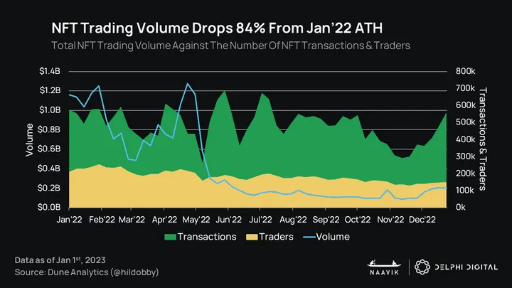Secondary market NFT transaction volumes, which display actual economic activity across various blockchains, are similarly in the doldrums.