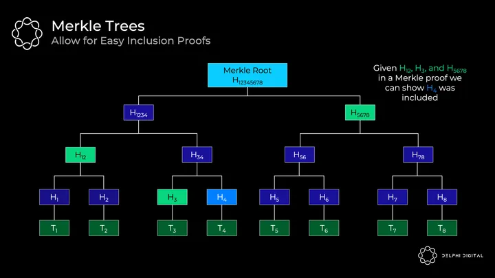 This is a helpful data structure for proving inclusion of a transaction without needing to download the whole tree. For example, if you wanted to verify that transaction H4 is included, you just need H12, H3, and H5678 in a Merkle proof. We have H12345678 from the block header. So a light client can ask a full node for those hashes then hash them together per the route in the tree. If the result is H12345678, then we’ve successfully proved that H4 is in the tree.