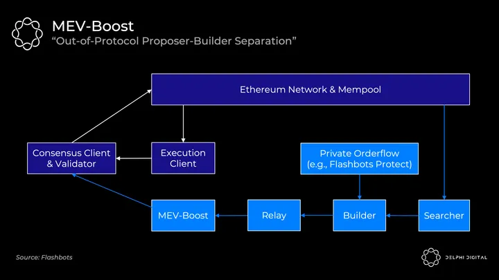 Validators post-merge will default to receiving public mempool transactions directly into their execution clients. They can package these up, hand them to the consensus client, and broadcast them to the network. (If you need a refresher on how Ethereum’s consensus and execution clients work together, I cover this in Part IV).