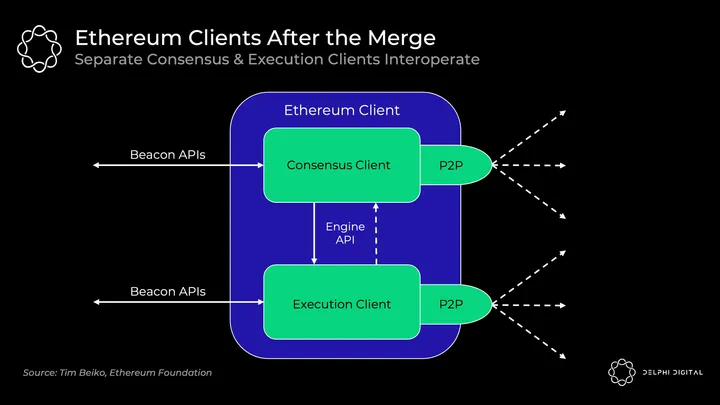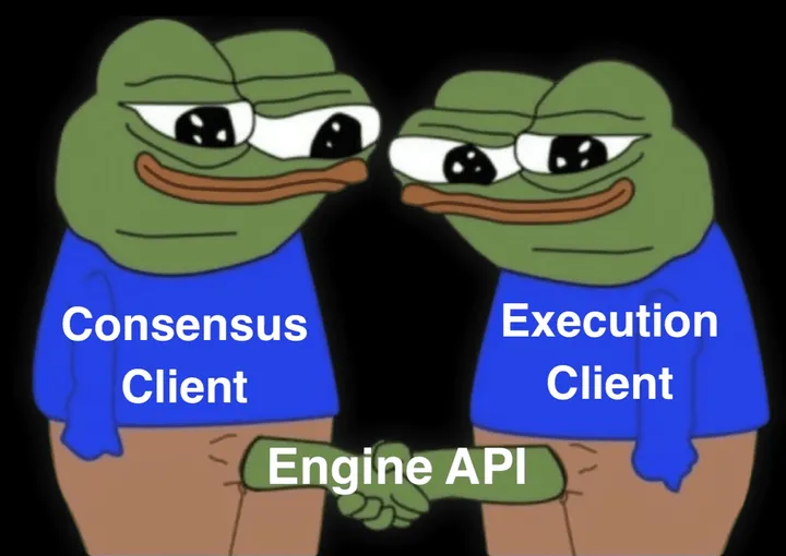 Clients receive Beacon Chain blocks, execution clients run the transactions, then consensus clients will follow that chain if everything checks out. You’ll be able to mix and match the execution and consensus clients of your choice, all will be interoperable. A new Engine API will be introduced for the clients to communicate with each other: