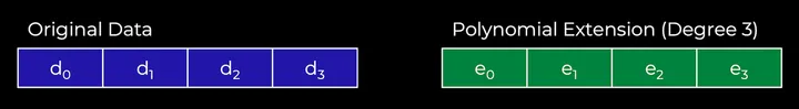 The original data is the polynomial f(X) evaluated at the positions f(0) to f(3), then we extend it by evaluating the polynomial at f(4) to f(7). All points f(0) to f(7) are guaranteed to be on the same polynomial.