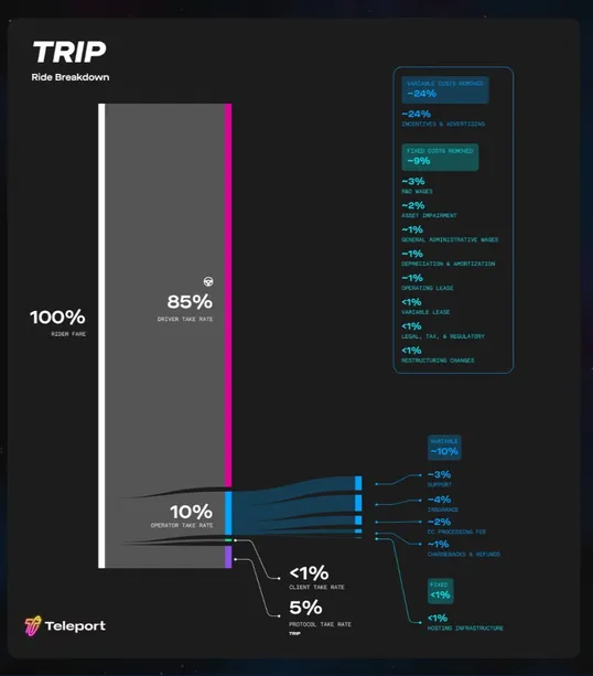 Teleport eliminates advertising and unnecessary fixed costs such as R&D wages. The TRIP protocol passes on cost savings to drivers and riders and incentivizes them to recruit new users. A complete analysis of cost structure differences can be found in Teleport’s Ridesharing Econ 101.