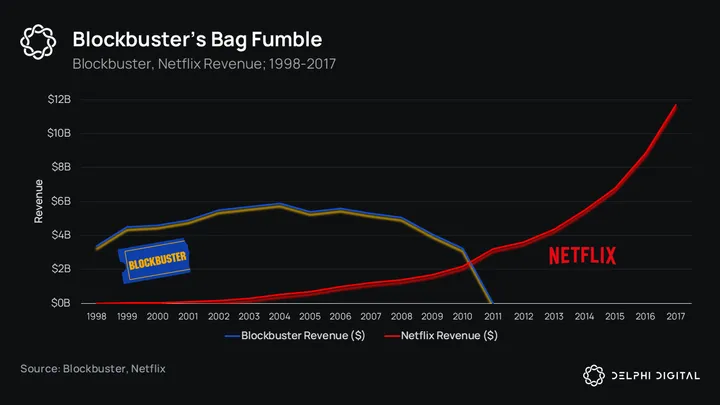 Blockbuster reached its peak revenue of $6B in 2004. It was still generating $4B in 2009 before a rapid decline into bankruptcy in 2010. Blockbuster declined to purchase Netflix for $50M in 2000, showing a dedication to brick-and-mortar stores for media content on the cusp of the internet age. This unwillingness to adapt resulted in a rapid downfall.