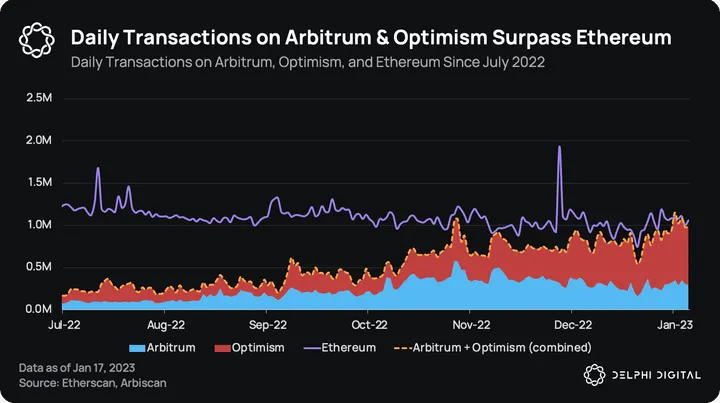 After a blockbuster 2022, the new year is off to a great start with combined daily transactions on Arbitrum and Optimism surpassing Ethereum on Jan. 12, 2023. Over the past 6 months, combined daily transactions have increased by over 5x from 163K to 983K. However, over the past month, one of the two major L2s is increasingly doing most of the heavy lifting in this combination.