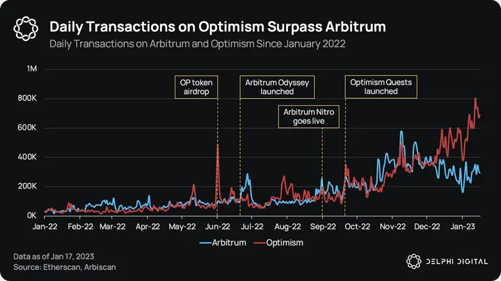 Optimismâs daily transaction count has steadily increased since March 2022 despite the bear market, hitting an all-time high of 800K on Jan. 12, 2023. Meanwhile, Arbitrumâs daily transaction count is down 49% from an all-time high of 576K on Nov. 8, 2022. However, TVL on Arbitrum has stayed relatively flat since November 2022, while most other blockchains have seen a decline.