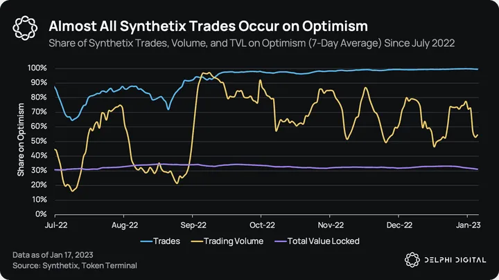 Deploying on Optimism has been hugely beneficial for Synthetix, and we expect other protocols to follow this lead and deploy on L2s over the coming months and years as they aim to capture as large of a user base as possible. We explore these trends in further detail in our August 2022 report on Synthetix, which is available for Delphi Pro members here. Here is an edited snippet from the report: