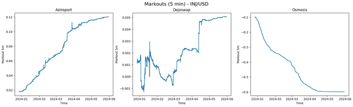 Ideally, markouts should be positive and show a consistently increasing trend. Since AMMs provide liquidity at stale prices, this is usually not the case. In stark contrast to expectations and consistent with the ideal scenario, Astroport’s INJ/USD PCL pool has a positive and consistently increasing markouts trend. Dojoswap’s markouts dip in the negative, but are mostly pretty close to 0. The same pair on Osmosis’ concentrated liquidity pool has a consistently decreasing trend, completely contrary to the ideal scenario. This can be explained by the fact that Osmosis CL pools have fixed fees and provide good execution (due to concentration of liquidity) at stale prices. This design is advantageous to arbitrageurs and is at the expense of LPs.