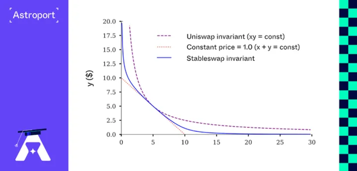 - Stableswap (blue line): The stableswap AMM design integrates elements of both constant sum AMM and constant product AMM. It uses an amplification parameter (A) that determines how close the stableswap curve should be to the constant product curve. Simply put, if A = 0, it mimics an XYK AMM curve, while higher values of A push the curve closer to a constant sum AMM.