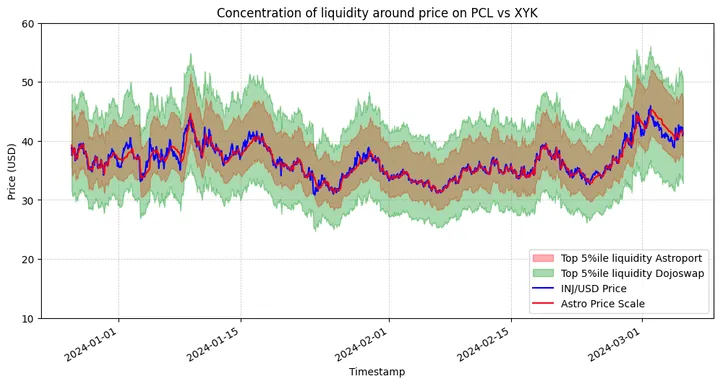 When comparing Astroport’s PCL pool for the INJ/USD pair against another automated market making model (Dojoswap’s XYK pool), it highlights another large advantage of PCL. PCL pools are designed to concentrate liquidity around the current price rather than passively deploying it across the $0 to $infinity (XYK). In practice, the top 5 percentile liquidity is concentrated as shown above, much tighter than an XYK AMM.