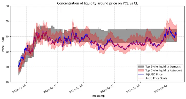 In order to show the difference in practice, we compared liquidity concentration between Osmosis concentrated liquidity and Astroport’s PCL pool for the INJ/USD pair. As you can see, top Osmosis liquidity providers are consistently out of range for extended periods while Astroport successfully concentrates liquidity automatically around the spot price. The above graph highlights the imperfect state of liquidity concentration we see on Osmosis often, over the course of >2 months. Meanwhile, Astroport’s PCL pool still effectively re-adjusts with strong price changes, such as the move between $22 – $44.
