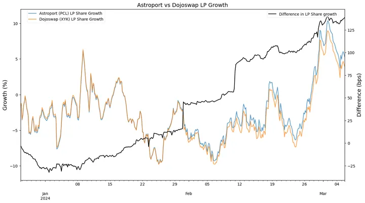 When comparing Astroport to Osmosis on adoption metrics, we notice that the gap in TVL doesn’t fluctuate as much as the gap in volumes. During the first half of the last year, Astroport volume surged higher than Osmosis on certain days, despite having a lower TVL. That is not the case anymore, with Osmosis’ volumes being much higher than Astroport. As shown by the markout analysis above, and other AMM research, concentrated liquidity pools don’t have a mechanism to discriminate between informed and uninformed order flow. Therefore, it’s likely that some of Osmosis’ high volume numbers are to the detriment of LPs. In comparison, Astroport’s volumes were 12% of Osmosis’ volumes, while Astroport’s fee returns were 15% of Osmosis’ fee returns.