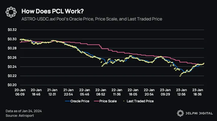 PCL’s algorithm allows passive liquidity to adapt to market conditions, particularly in response to volatility. As the gap between the Price Scale (maximal liquidity concentration) and the Oracle Price (where liquidity is in equilibrium) widens, it indicates increased volatility. PCL pools respond by dynamically adjusting their fee structure. The wider the difference between Price Scale and Oracle Price, the higher the fees. This is akin to traditional market makers who widen bid-ask spreads in volatile markets to generate higher profits.