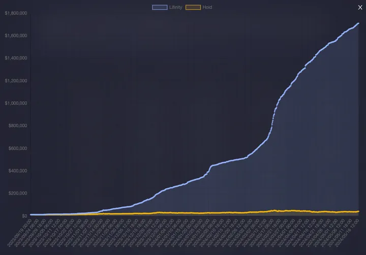 While walled gardens are typically looked down upon in crypto, Lifinity cannot come close to offering triple and quadruple digit APRs without having alpha, and naturally, they’’re secretive about it. That said, a key reason behind Lifinity’s success is avoiding toxic order flow with the help of oracles to price assets in the pool. To give a quick refresher on toxic order flow in the context of AMMs, this refers to the losses incurred by LPs by providing liquidity at stale prices to arbitrageurs – also known as IL and LVR. To give context on LP returns on Lifinity, the following stats on the Lifinity frontend compare Lifinity’s returns compared to a 50/50 portfolio held from September 2023 for the pair listed “SOL-USDC2 – v2”. A “hold” portfolio would have returned an impressive 334% from start to peak, but Lifinity made an astronomical 14769% in the same time frame.