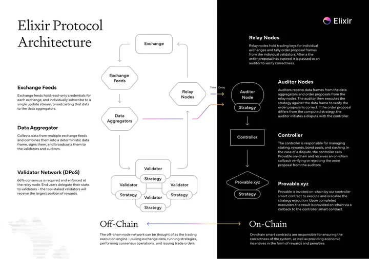 In order to be trustless and decentralized, they employ a network of data aggregators, validators, auditors, etc. to ingest live orderbooks and supply liquidity in a secure way. The network uses DPoS to reach consensus on blocks. The architecture is illustrated by the following infographic.