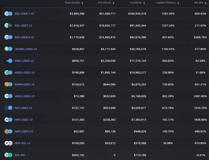Lifinity allows passive liquidity provision, while still affording the greater returns of active liquidity management. They very accurately describe their DEX as a “proactive market maker”. Lifinity enables the passive liquidity experience and great returns by using their closed-source market making algorithm in the backend. Top pools on Lifinity are SOL or SOL derivatives paired with stables, BONK, RAY, etc., as shown below.