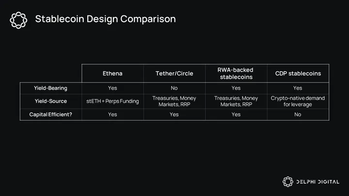 Given that the Ethena model comes with fundamentally different risks relative to CDPs and RWA-backed stablecoins (as we will discuss later), the market has been quick to label USDe as a “synthetic dollar” and not a true stablecoin. While this categorization seems fair, it is worth noting two structural advantages that the USDe model has over existing yield-bearing stablecoin designs.
