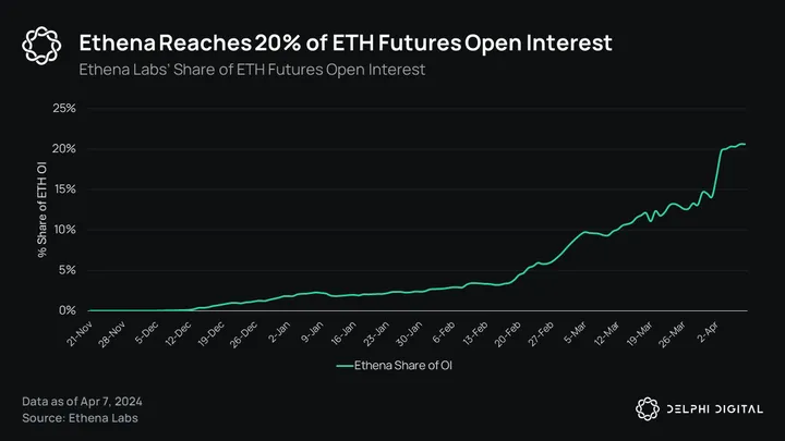 Intuitively, this makes sense. Funding rates are ultimately a function of supply and demand. Ethena inherently introduces more supply into the market, which, without enough counterparties to suck up each dollar of new supply, should push funding rates lower. Ethena already constitutes over 20% of ETH-PERP open interest (OI).
