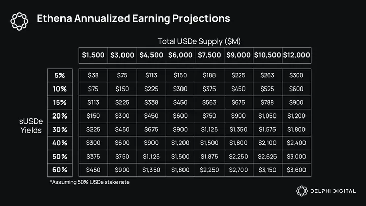 While the aforementioned scenarios certainly hinges on some optimistic assumptions, it is worth noting that even under more bearish forecasts, Ethena would still be one of the most profitable crypto protocols to date. If Ethena is simply able to maintain current USDe supply of around $2B, and sUSDe yields remain elevated at around 40%, Ethena is estimated to generate around $400M in annual earnings at a 50% stake rate.