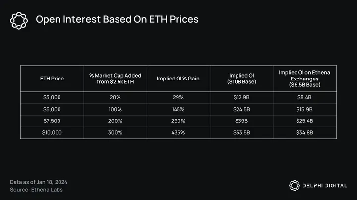 Contextually, total open interest on ETH contracts is sitting at around $8bn today, excluding CME. The Ethena team believes that owning more than 30% of total OI starts to introduce liquidity risks around being able to safely unwind these shorts. Therefore, in this context of just using ETH as collateral, USDe should be able to safely scale to about $2.4B.