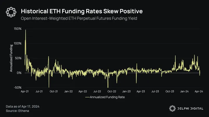 While staked ETH yields alone have historically been higher than treasury yields on average, the majority of USDe’s yield comes from the second leg of the delta-neutral trade. Given that the natural resting state of ETH and BTC perps funding rates on has been long-biased, market participants who are short this delta exposure have historically enjoyed lucrative funding rates.