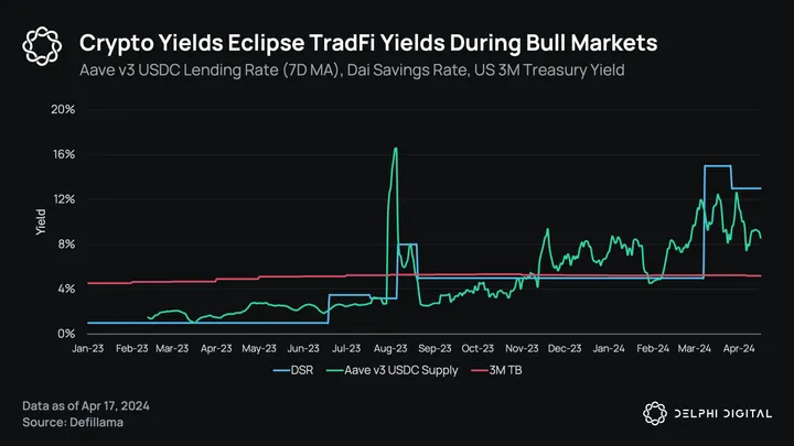 On the one hand, RWA-backed stablecoins seem to be playing the wrong game. While bringing TradFi interest rates to crypto may be an attractive value prop during bear markets, these products become increasingly less attractive as soon as crypto-native yields eclipse treasury yields.