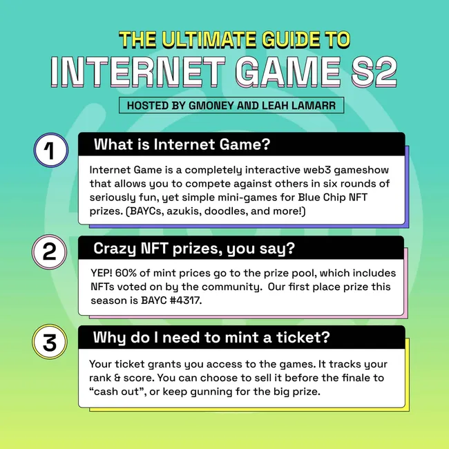 - After a successful season one, Internet Game officially launched its season two gaming event. This season saw 4,800 tickets minted at 0.069 ETH each. The season raised more than 300 ETH, out of which 120 ETH was set aside for the prize pool.