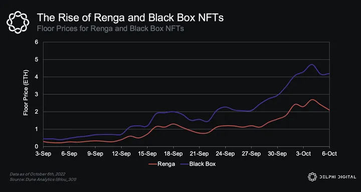 - Renga Black Box NFTs, which holders can burn to mint a Renga NFT, have also charted a similar trajectory. In the last 30 days, floor prices for the Black Box NFTs have also increased more than 900% from a low of 0.47 ETH to a high of 4.72 ETH. Currently, the floor price sits at 4.18 ETH.