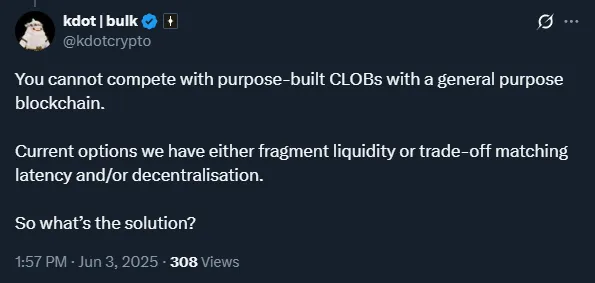 The reason is structural. All applications share a common global scheduler (the leader) and must compete within the same block production pipeline. Even with integrations like Alpenglow’s deterministic finality and BAM’s ability to isolate app-specific execution domains, there remains a class of workloads that require more granular control than an L1 can reasonably provide. HFT-style trading and on-chain CLOBs are one of these types of applications.