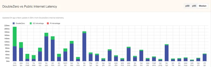 DoubleZero minimizes these inconsistencies by ensuring that all validators participating in consensus receive messages within uniform, predictable timeframes. Instead of relying on best-effort internet paths, DoubleZero establishes a controlled network environment with optimized routing and traffic prioritization. This uniformity compresses the gap between the fastest and slowest validators, allowing Votor to finalize votes in fewer rounds and Rotor to disseminate blocks more evenly.