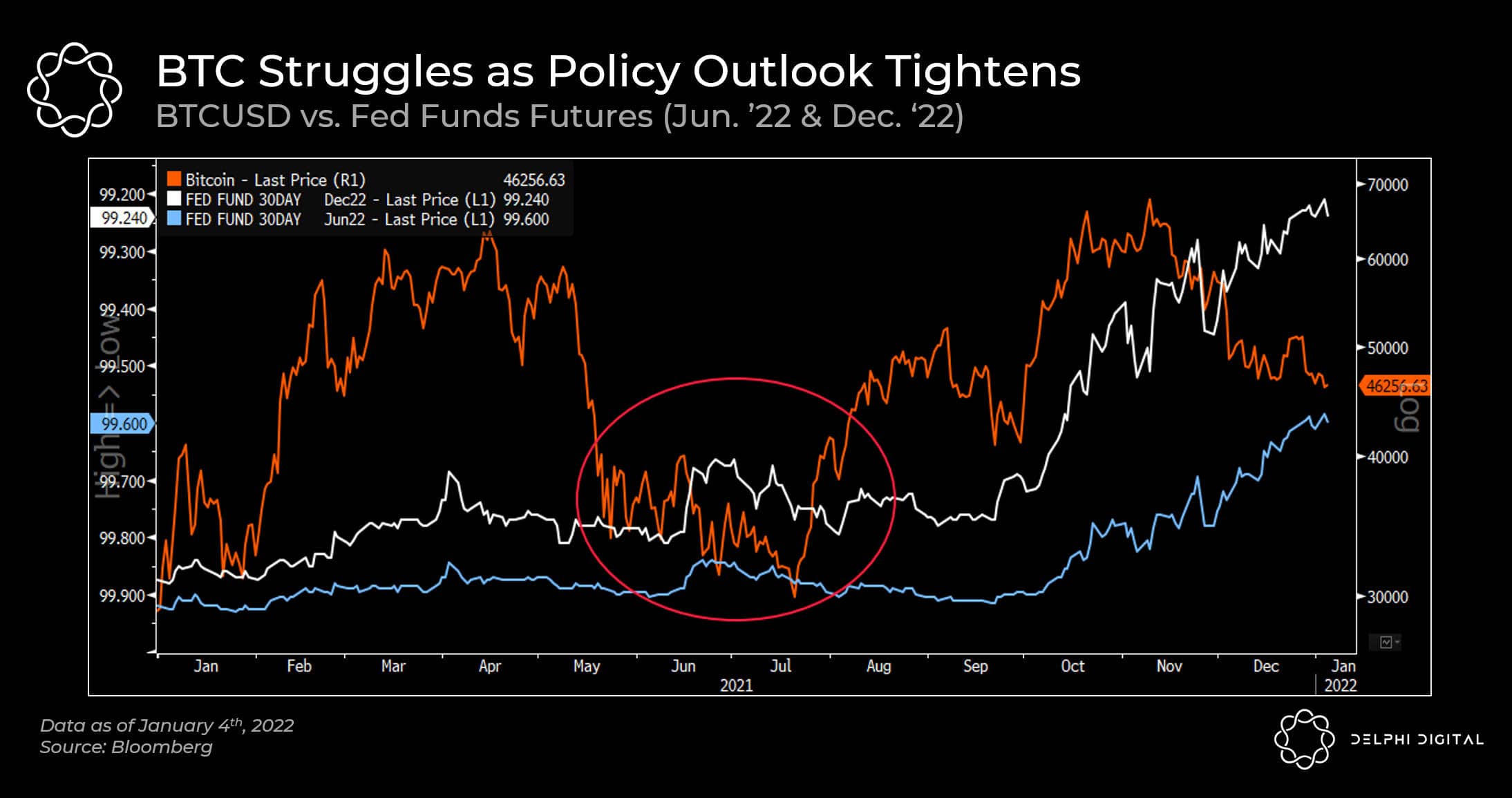- We saw a glimpse of this last summer when forecasts for Fed funds futures began to tick higher as headline CPI in the U.S. topped 5% on a year-over-year basis. BTC did not perform well (to say the least) and it’s sell-off was exacerbated by mass liquidations and deleveraging.