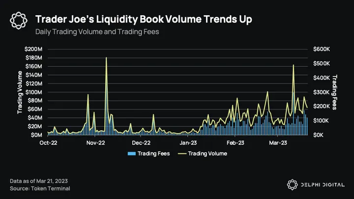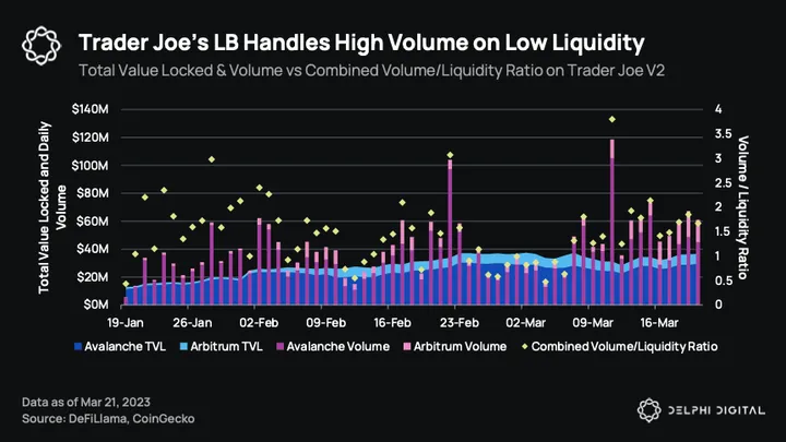 As a result, Trader Joe has been able to attract significant trading volume with minimal liquidity. LB achieved a high of $118M in daily volume with just $31.1M of TVL on March 11th, 2023, representing an impressive 3.8x volume-to-liquidity (V/L) ratio.