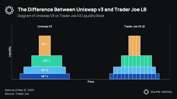 In contrast, Trader Joe’s v2 Liquidity Book is a concentrated liquidity DEX similar to Uniswap v3 but with some key differences.