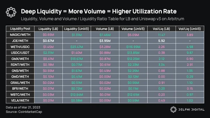 Deeper liquidity often translates into higher trading volumes due to better execution. LB acts in a similar fashion even though it has a different mechanism. There is only one edge case, where the MAGIC/WETH pool has lower liquidity but more volume than Uni v3.