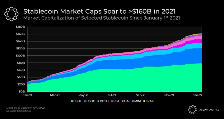 Stablecoins exploded in 2021, surpassing $150B in combined market capitalization. This surge is a testament to great product-market fit as one of crypto’s “killer apps,” with assets like USDC and USDT becoming almost ubiquitous across the entire crypto ecosystem. We strongly believe this trend will continue on the back of a few major catalysts that have paved their success thus far: