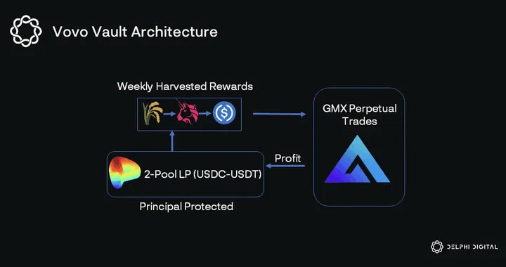 Principal-protected vaults offered by Vovo Finance deposit user funds into Curve Finance liquidity pools. Farming rewards are harvested weekly and converted to USDC.