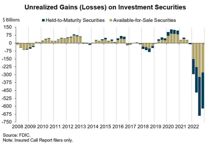 For a while, things were fine because the bankās depositors werenāt demanding their money back. The losses on the bond portfolio didnāt show up in the bankās books either. When banks buy bonds, they have the ability to classify them in one of two ways: Available-For-Sale (AVS) or Held-To-Maturity (HTM). Thereās only one difference that matters ā when bonds classified as HTM go down in price, the bank doesnāt need to reflect the loss in its books. These unrealized losses among US banks have risen to a record $680B in 2022.