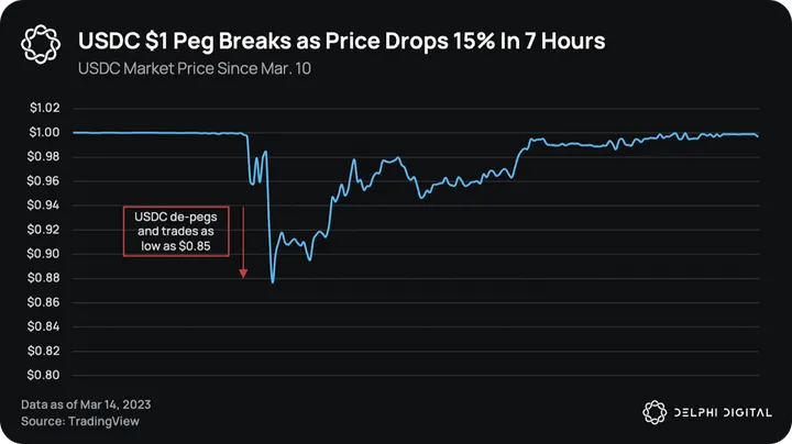Contagion from this fallout was fairly contained as the bank runs have not yet spread to other banks. However, the bankās failure found a way to strike at the heart of the crypto economy. Circle, the issuer of the second-largest stablecoin USDC, held $3.3B of reserves at Silicon Valley Bank. Just before the FDIC took over, Circle had requested funds to be wired out to other banks. Looming uncertainty over the backing of USDC caused the token to de-peg and trade as low as $0.85. While USDC has since recovered, the event threw a surprise stress test for much of DeFi.