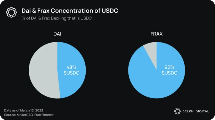 USDC forms 48% of the collateral backing DAI and 92% of the collateral backing FRAX. This led to even more de-pegs occurring alongside USDC with DAI trading as low as $0.86 and FRAX trading as low as $0.88.
