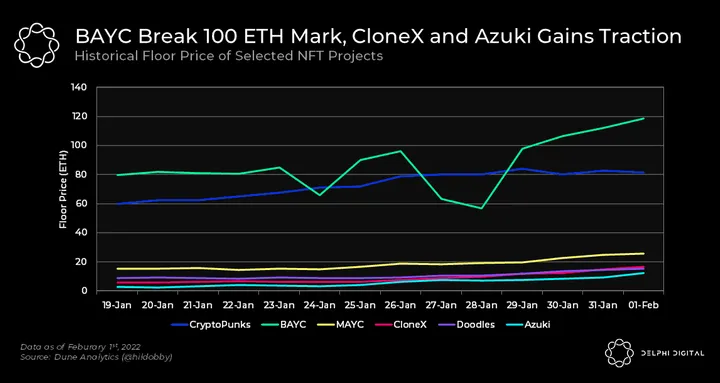 - BAYC has been on a consistent uptrend, with the price floor breaking the 100 ETH mark and already gunning for 120 ETH. With famous figures and accounts like Justin Beiber and 9GAG joining the club, the attention that BAYC gets is currently unparalleled. While far from the leaders, MAYC and CloneX have also steadily climbed.