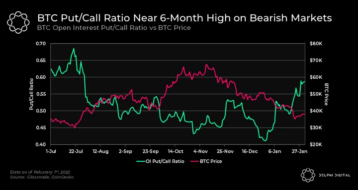 - BTC traders have become increasingly bearish on the markets as the Put/Call ratio has hit 0.58, the highest in nearly 6 months. The bearish markets and macro sentiments have led to more buyers of puts than calls.
