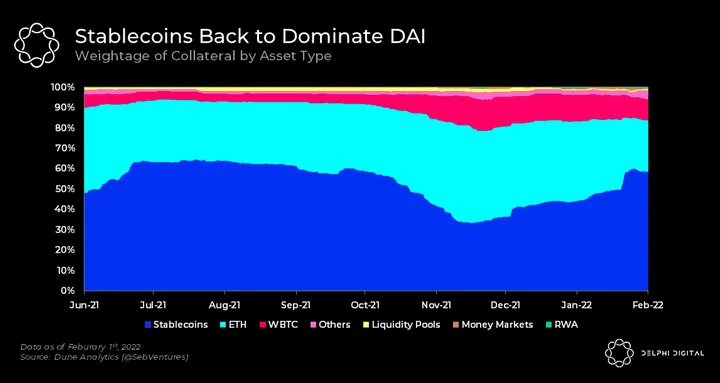 - DAI, a crypto-collateralized stablecoin by MakerDAO, has seen its asset weightage shift towards stablecoins. Many criticized DAI for being backed by 60% stablecoins, as it means that DAI is also exposed to the same centralization and regulatory risks of the stablecoins (mainly USDC).