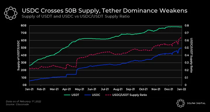 - USDC has grown massively over the past year, recently crossing $50B in supply. USDT is still the market cap leader, although its growth has slowed down compared to USDC since May 2021. The USDC/USDT supply ratio has grown from 0.2 to 0.64 over the past year.