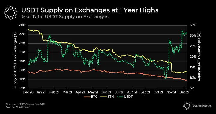 - USDT supply on exchanges is at a 1-year high, indicating that investors have become risk-averse and sold into stable assets. About 31% of the total USDT supply are sitting idle on exchanges, suggesting traders are turning risk-off or locking in end-of-year profits.