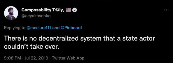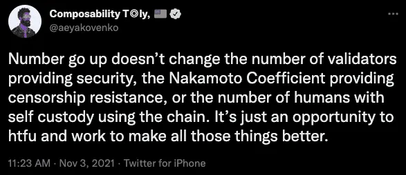 If we really are building the future of France on top of these networks though, I want the strongest assurances possible. Even against a state actor. It seems irresponsible to build a systemically important network for the global economy that an adversarial government could easily attack. You don’t have to look around too hard to realize that economic and cyber warfare are increasingly the preferred methods of offense. These systems must be designed in such a way to make these attacks cost in the many trillions of dollars so as to be infeasible. If number go up helps to protect that, then so be it!